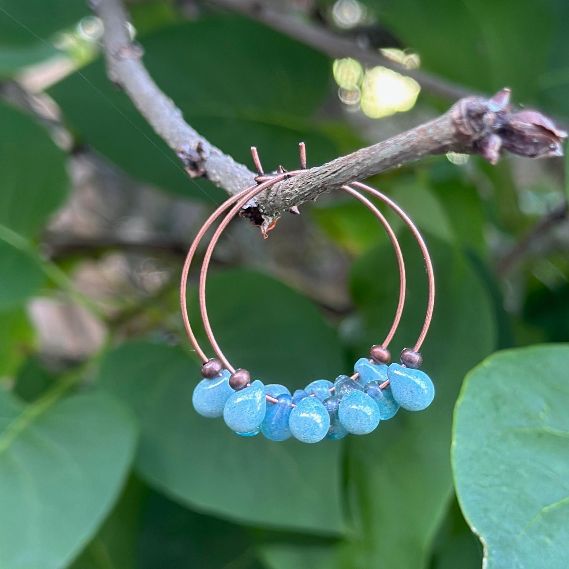 Beautiful blueish green glass briolette teardrop beads reminiscent of sea glass colors are simply hung onto antiqued copper hoop earrings. Also accented with a tiny copper bead on either side.