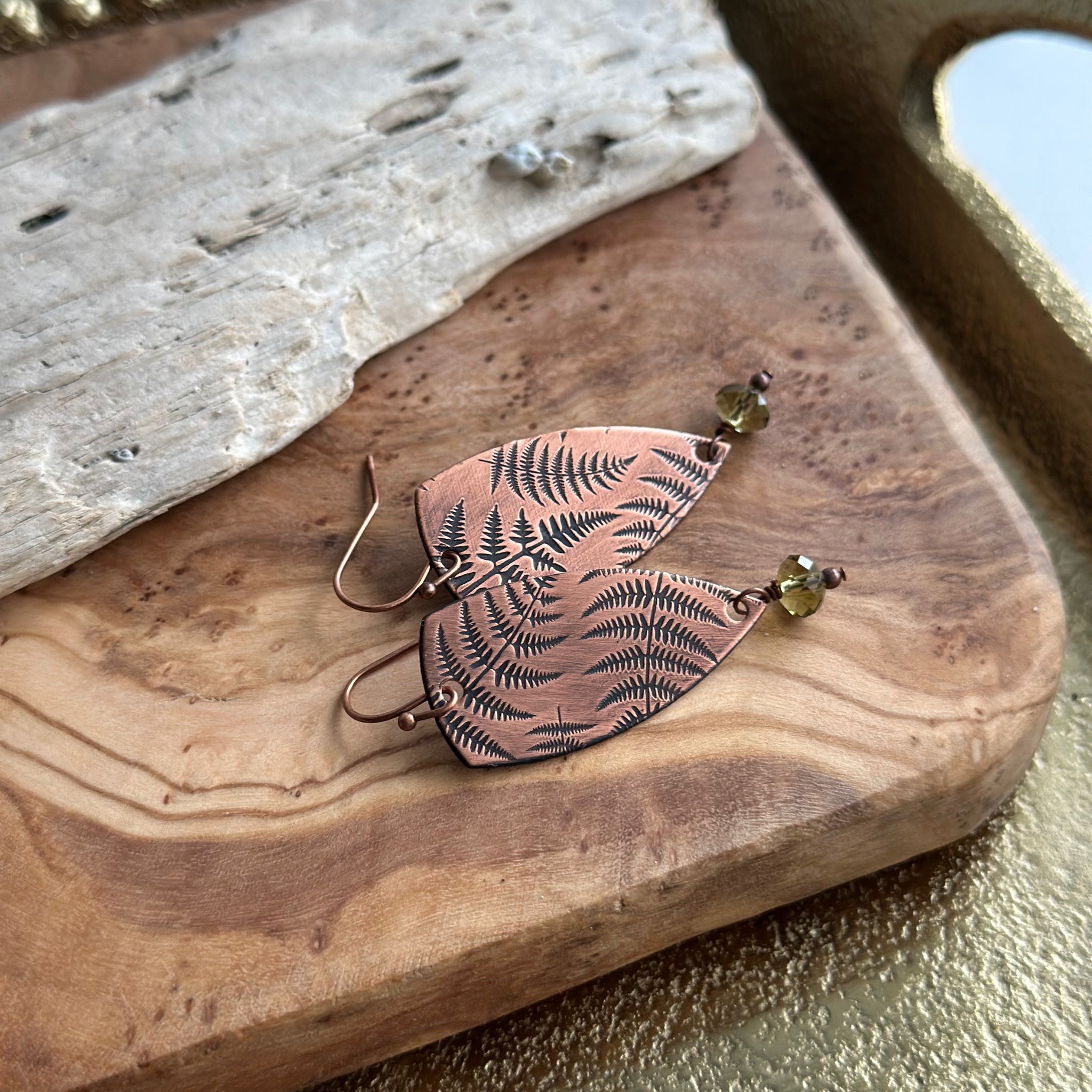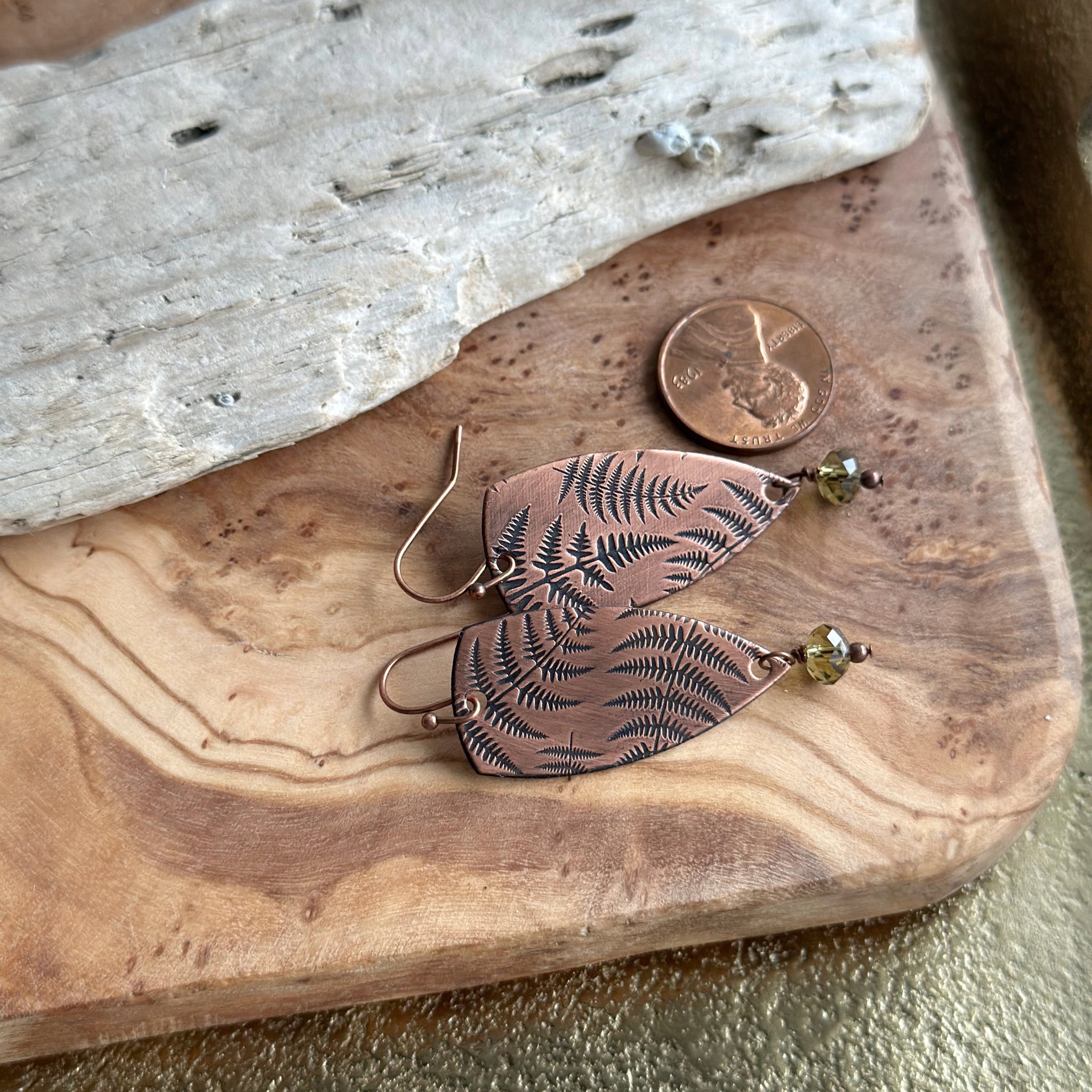 Copper is given a fern pattern and cut into dagger shapes and paired with green Swarovski crystals. Antiqued for that vintage look. Hang from antiqued copper ear wires.