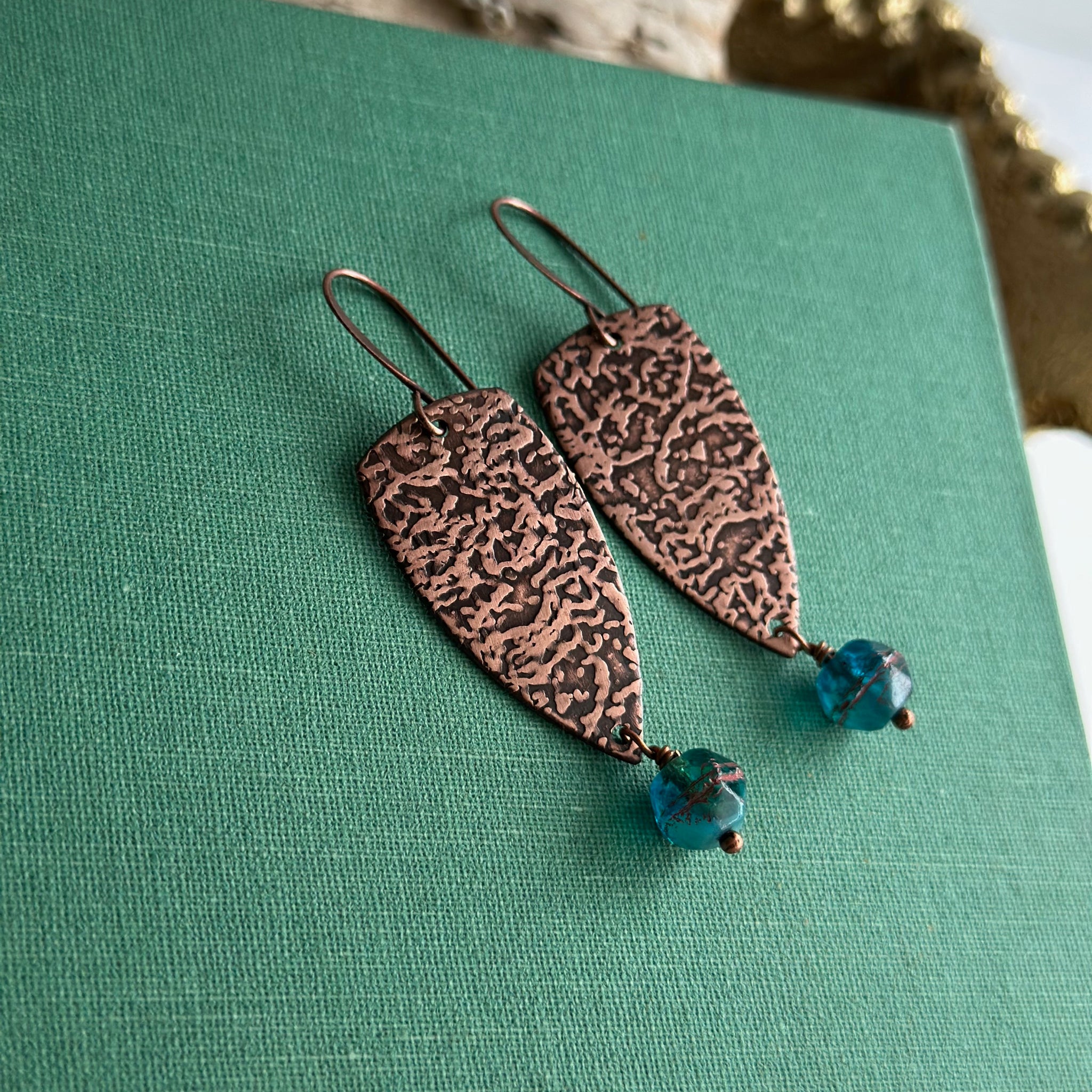 Copper is given a textured pattern and cut into dagger shapes and paired with blue teal Czech glass beads. Antiqued for that vintage look. Hang from antiqued copper ear wires.
