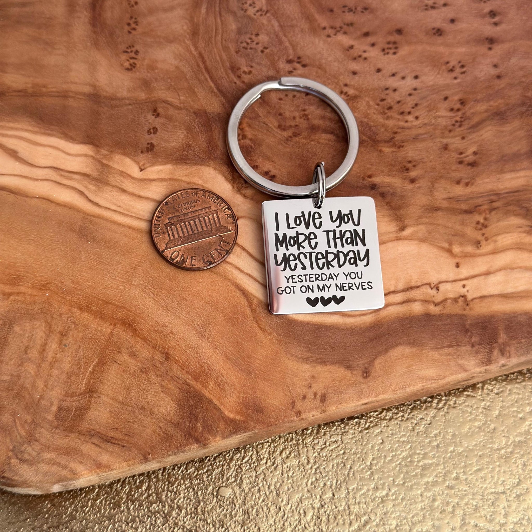A stainless steel shiny square is engraved with I love you more than yesterday, yesterday you got on my nerves. The perfect Valentine's Day gift for your favorite person or a just because gift.