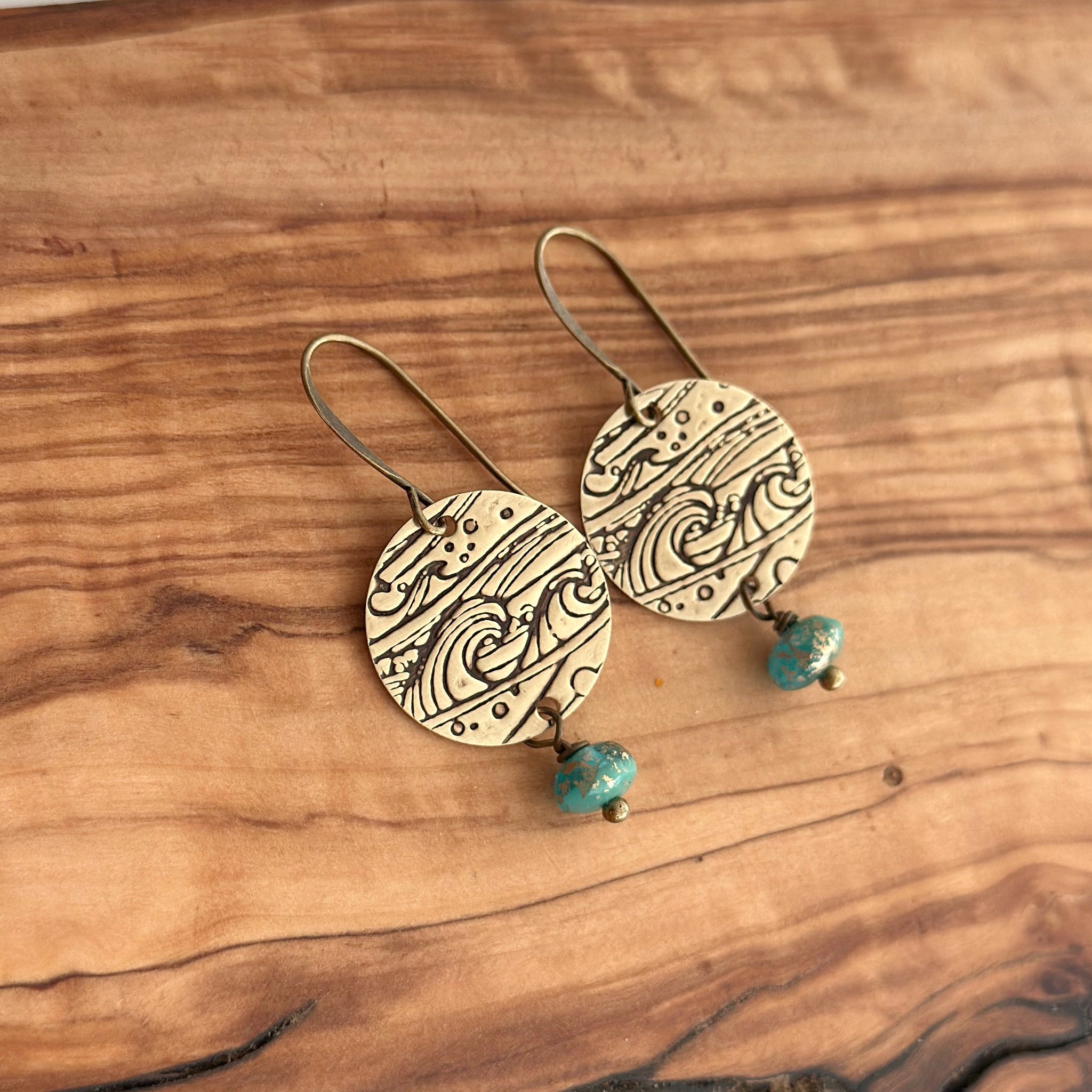 Gold speckled aqua Czech glass gems dangle from golden bronze circles textured with an ocean wave pattern and hang from antiqued brass ear wires.