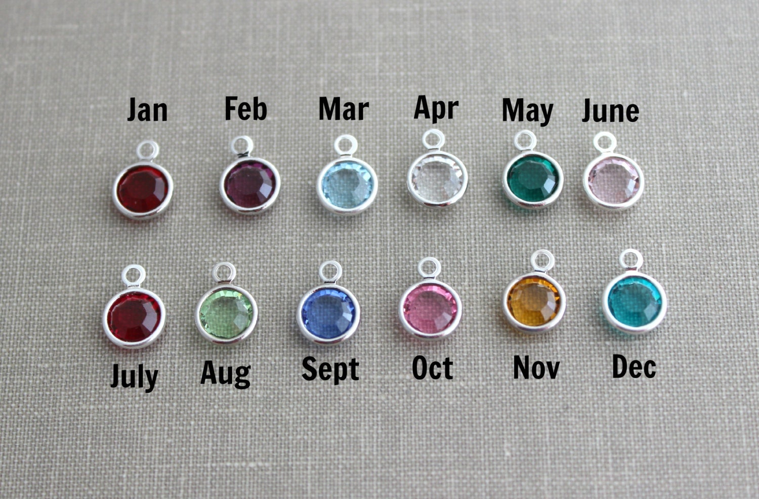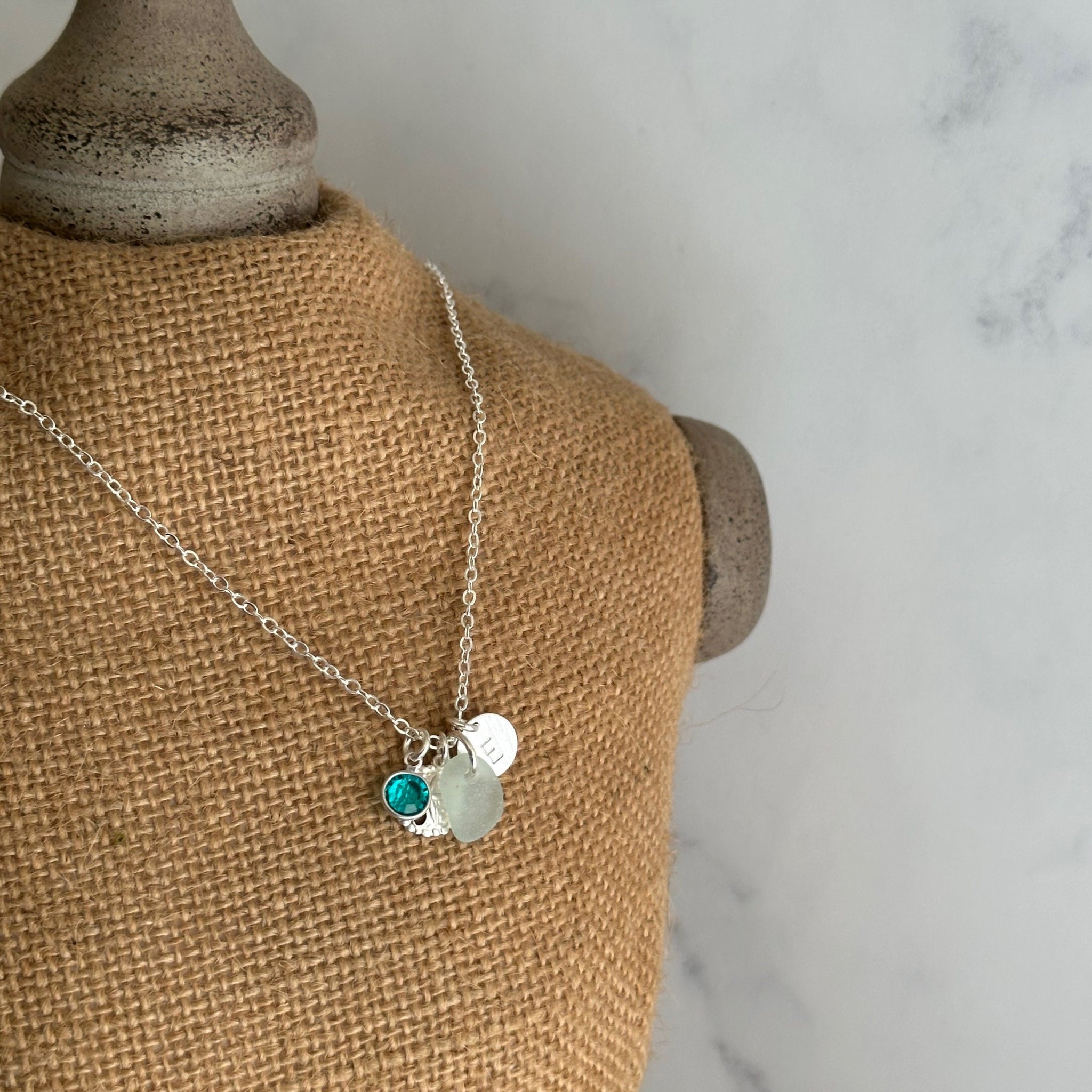 A delicate charm necklace for you or someone special! Necklace includes a small frosted seafoam piece of sea glass, sterling silver sand dollar charm (hollow back style), crystal birthstone and round sterling charm with letter of your choice. Necklace in photo is an example, your necklace will be made to order.