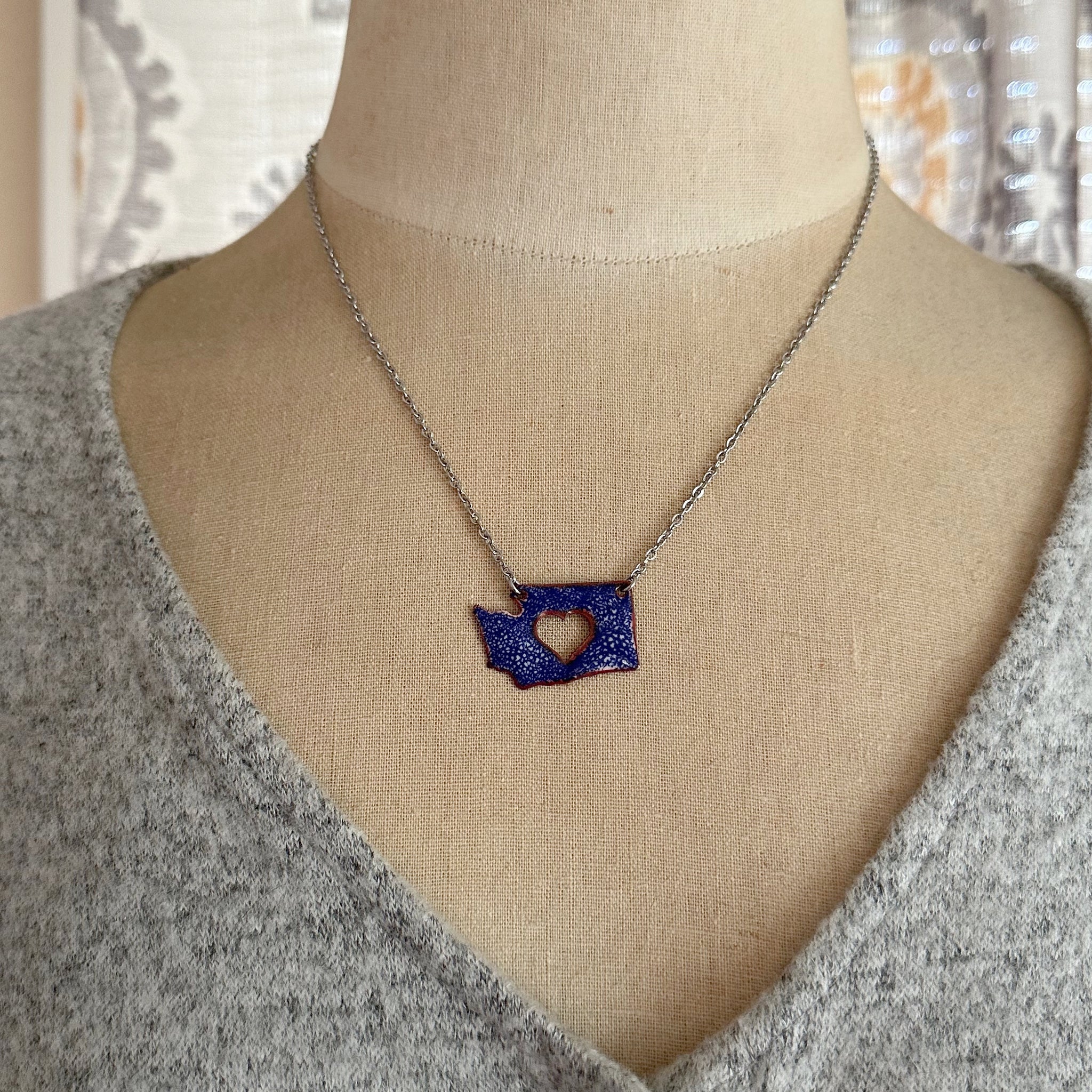 A copper Washington State with heart cut out is covered in deep cobalt blue enamel with a crackle base for white to peek through.